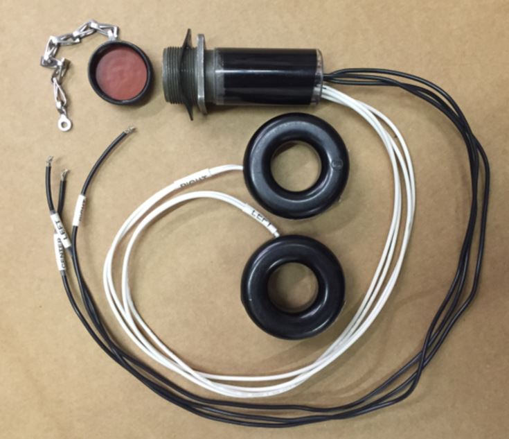 The Fixed Power Adapter Sensor uses two current probes that consist of toroidal secondary transformer coils that are permanently installed surrounding the leftmost and rightmost wires that feed power to the motor. The two current transformers are isolated by double insulation from the motor power. Three voltage leads are connected directly to the terminals on the downstream side of each of the three fuses and fed to the permanent connector pins through a resistance of 664 Kohms. At 480 Volts RMS, the RMS current is limited to 0.72 mA to ground, which is a safe value.